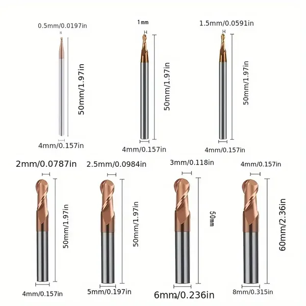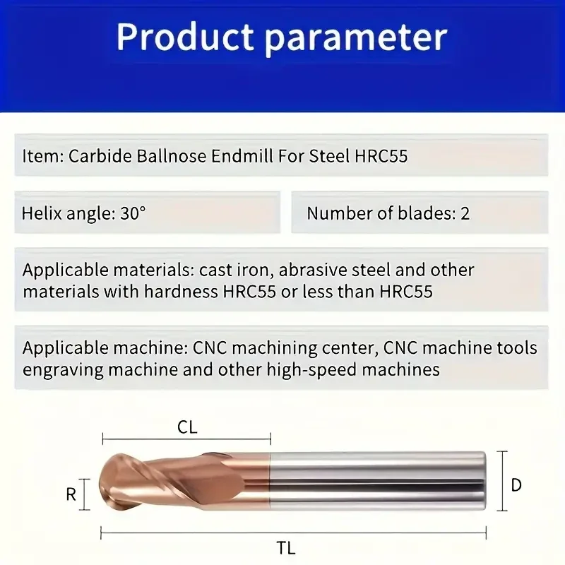 Carbide Ball Nose End Mill for Steel HRC55, 2 Flutes, Non-Center Cut, Tungsten Steel, Ticn Finish, CNC Machining Tool - Suitable for Cast Iron, Abrasive Steel and Materials Hardness below HRC55 - Sizes R0.5 to R4.0